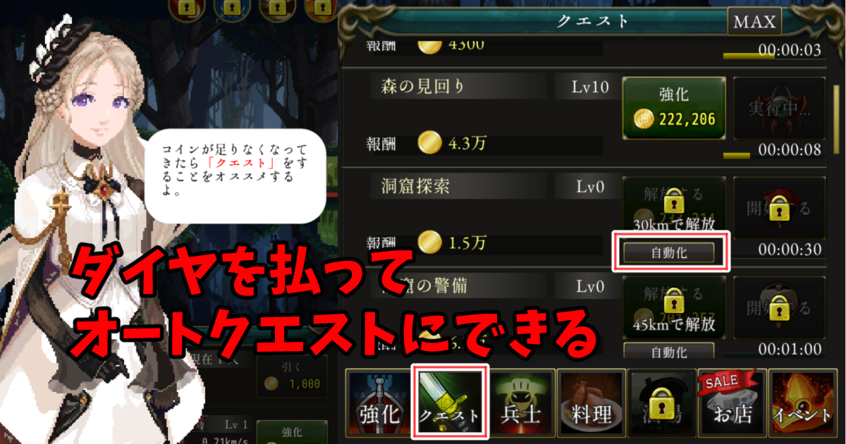 クエストは最初は手動ですが、ダイヤ消費によってオートクエストに切り替えることができます。